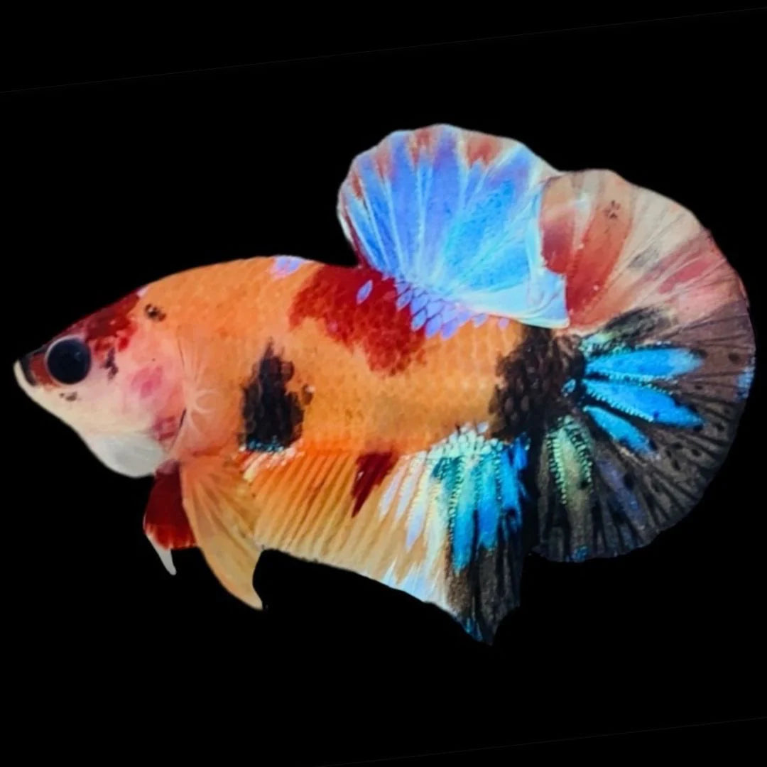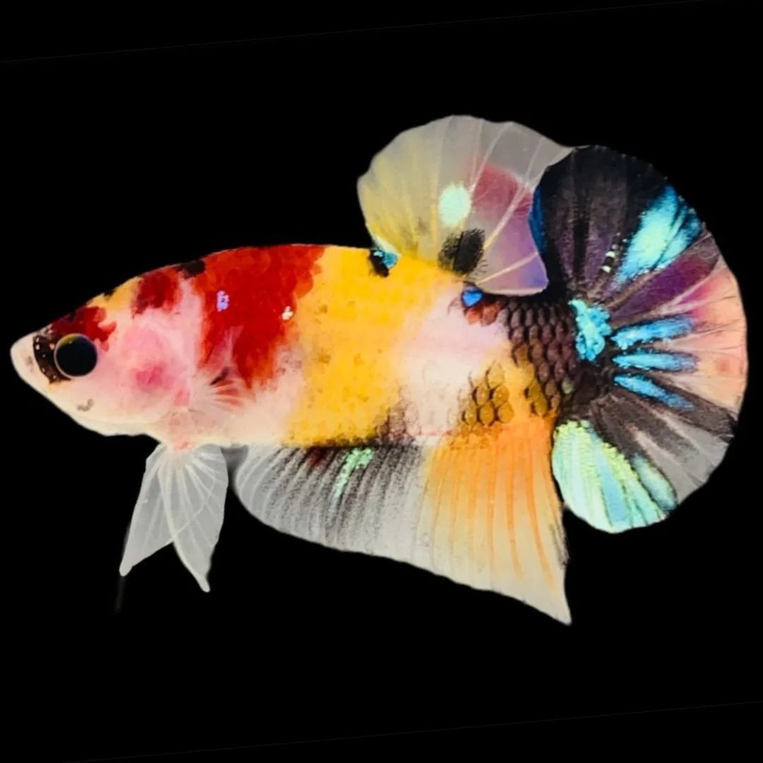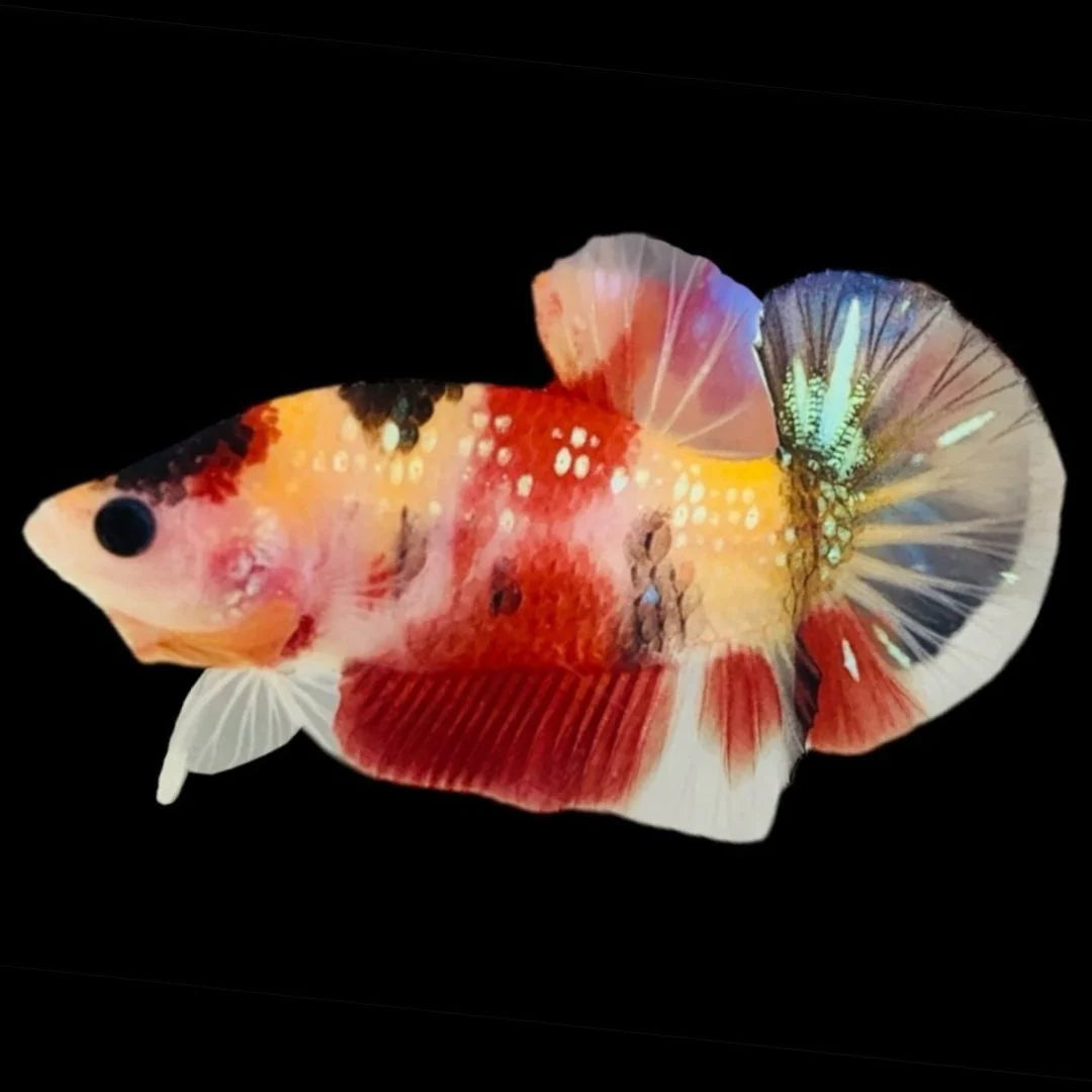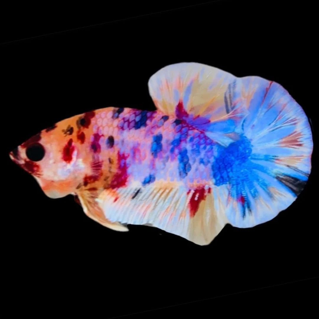 The Galaxy Koi Betta is a captivating variety of Koi Betta fish, renowned for its vibrant, speckled coloration that mimics the appearance of a starry galaxy blended with the distinctive patterns of koi fish. This mesmerizing mix of colors, often including shades of blue, red, white, and yellow, creates a celestial display reminiscent of stars scattered across the night sky. When it comes to care, the galaxy koi betta has similar requirements to other betta types. However, to maintain and accentuate its vibrant coloration, it's beneficial to provide a varied diet rich in high-quality nutrients. A tank with a calm environment, free from strong currents, is ideal. Also, since their unique color pattern is a significant part of their appeal, it's essential to keep the water clean and clear, allowing their stunning appearance to shine through. Regular water changes, a suitable diet, and a stress-free ambiance are key to the health and vibrancy of a galaxy koi betta.