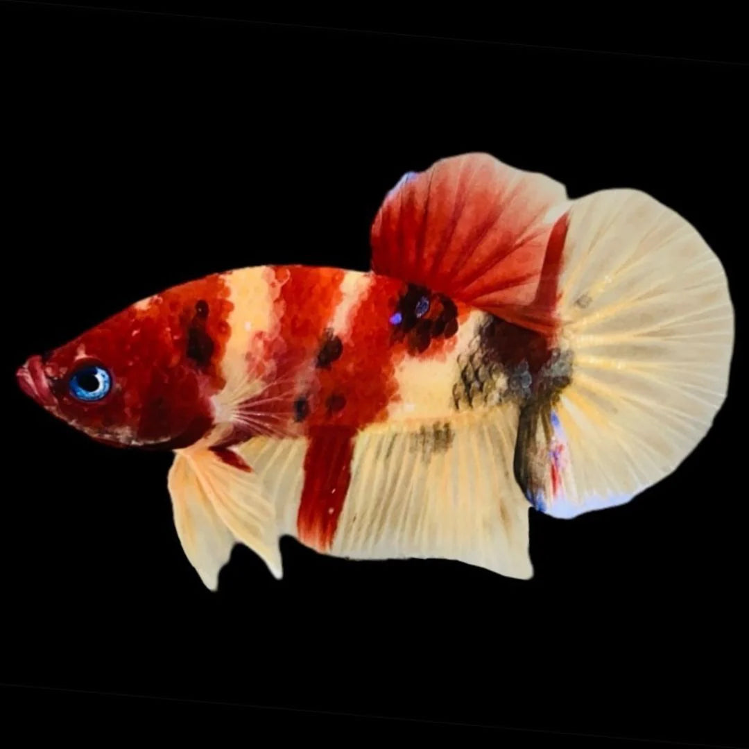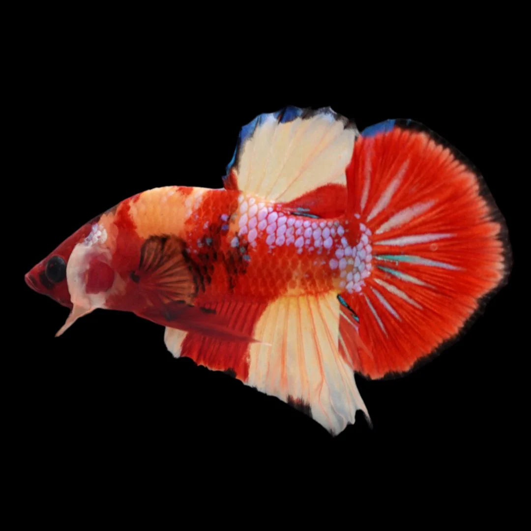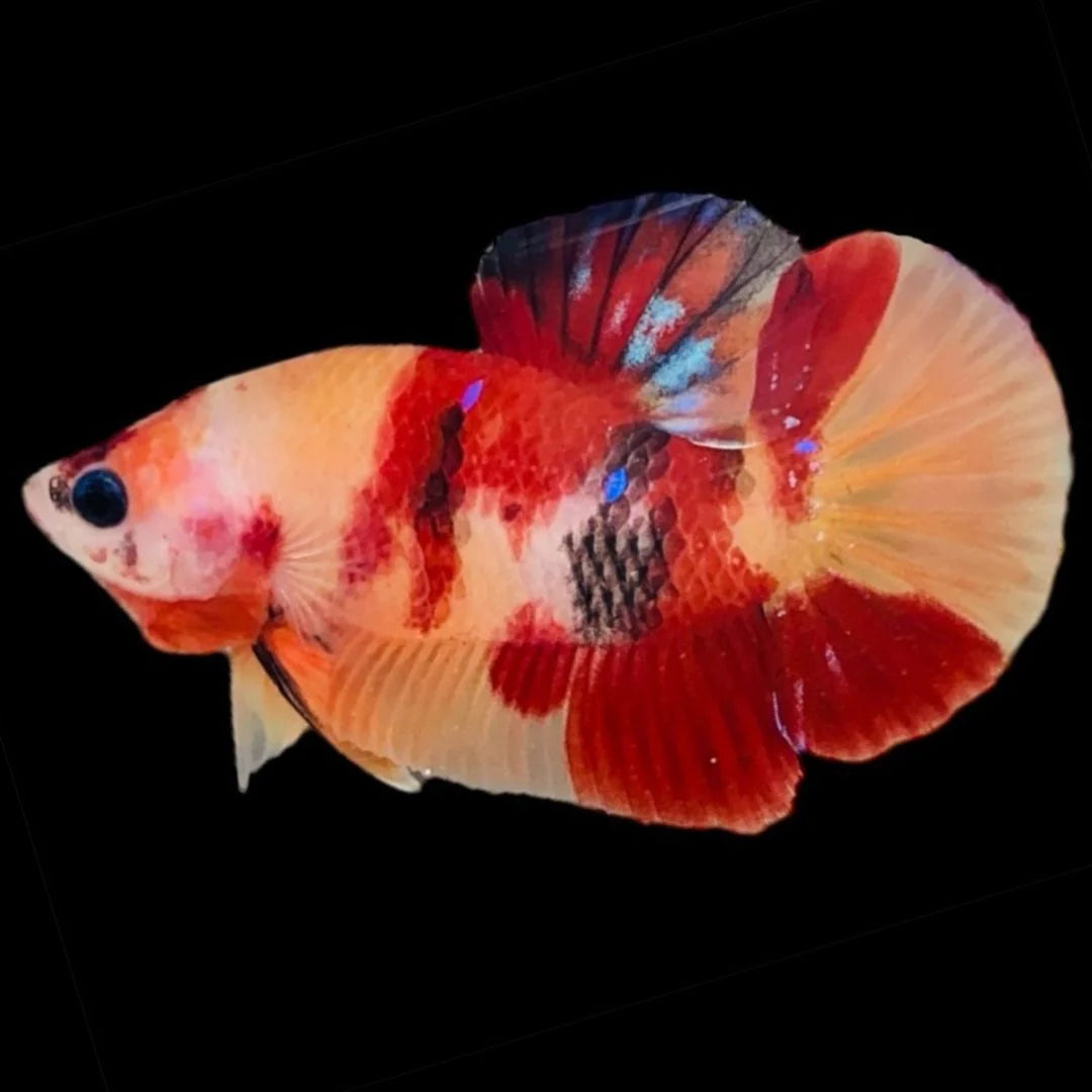 The Koi Betta is a standout among Betta fish due to its distinctive and captivating colouration. Drawing inspiration from the traditional Japanese Koi fish, Koi Bettas showcase a vibrant mottled pattern with a mix of white, red, orange, and sometimes even black or blue. This marbled appearance, combined with their lively personalities, makes them a sought-after choice among Betta enthusiasts.