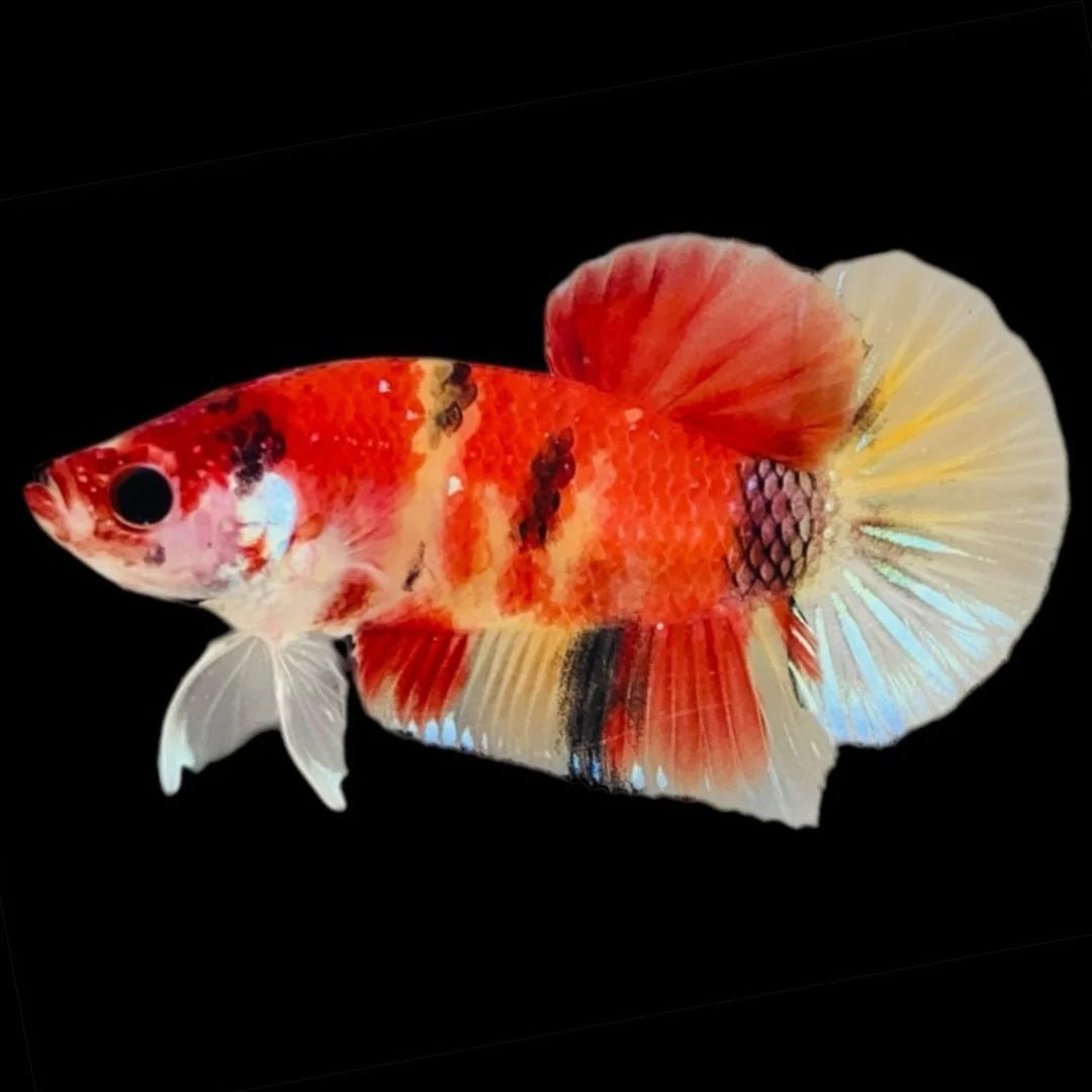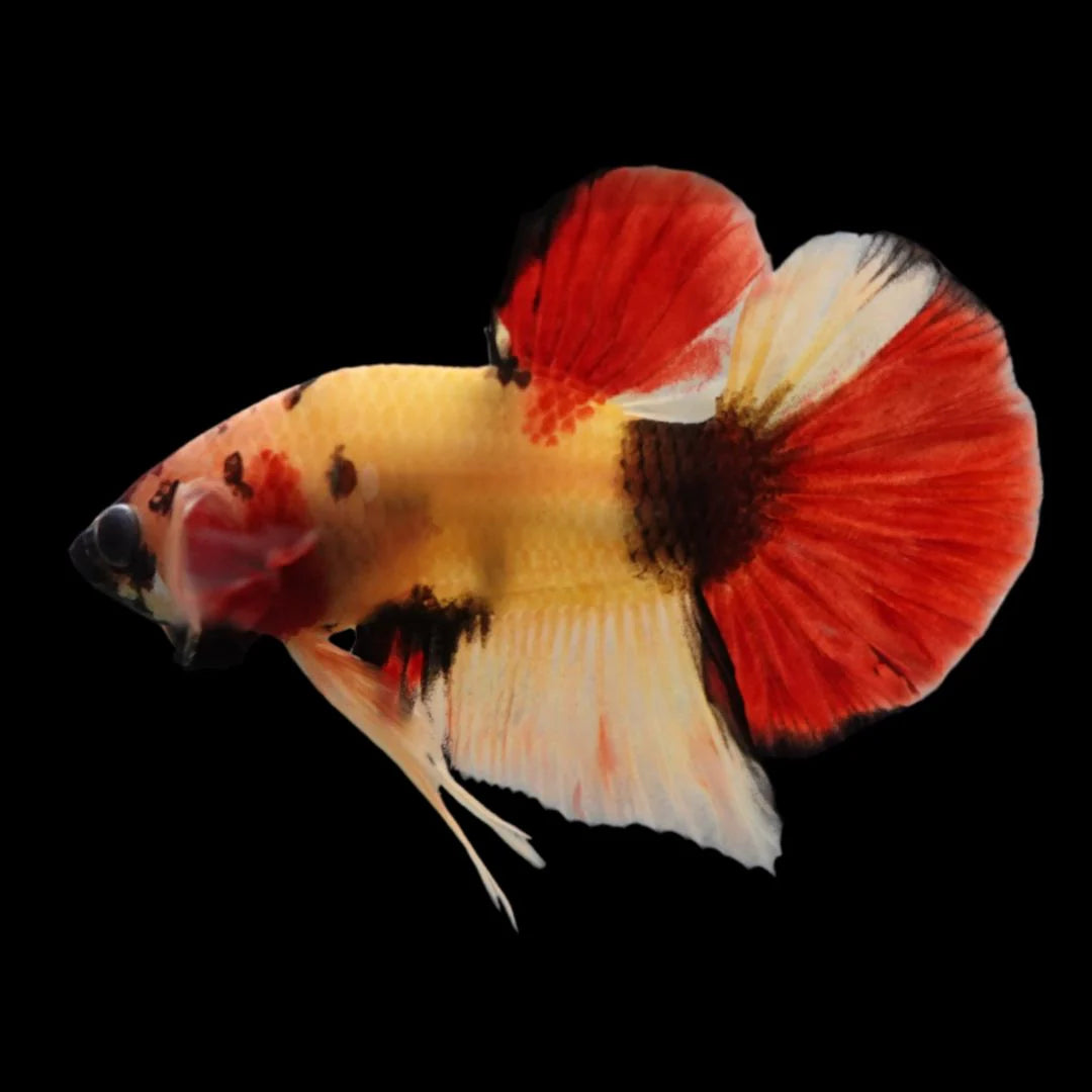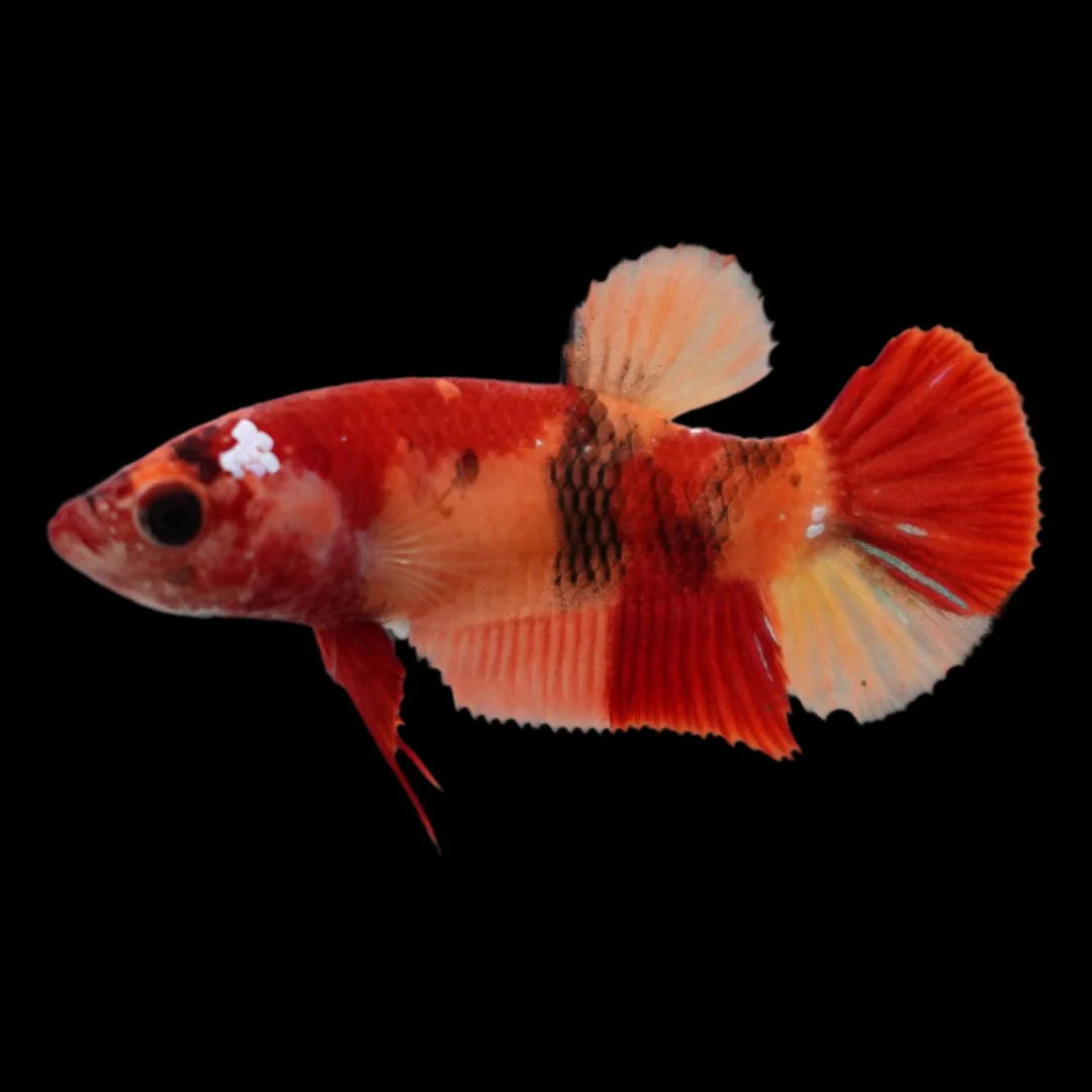 The Koi Betta is a standout among Betta fish due to its distinctive and captivating colouration. Drawing inspiration from the traditional Japanese Koi fish, Koi Bettas showcase a vibrant mottled pattern with a mix of white, red, orange, and sometimes even black or blue. This marbled appearance, combined with their lively personalities, makes them a sought-after choice among Betta enthusiasts.