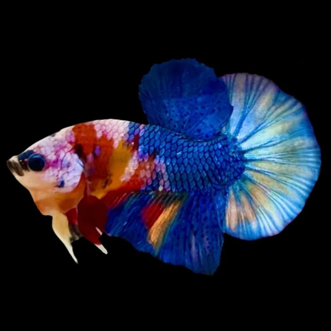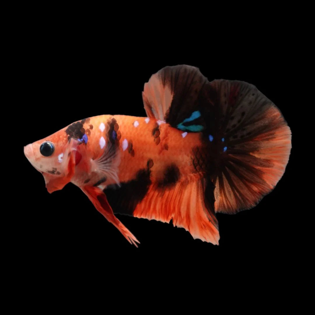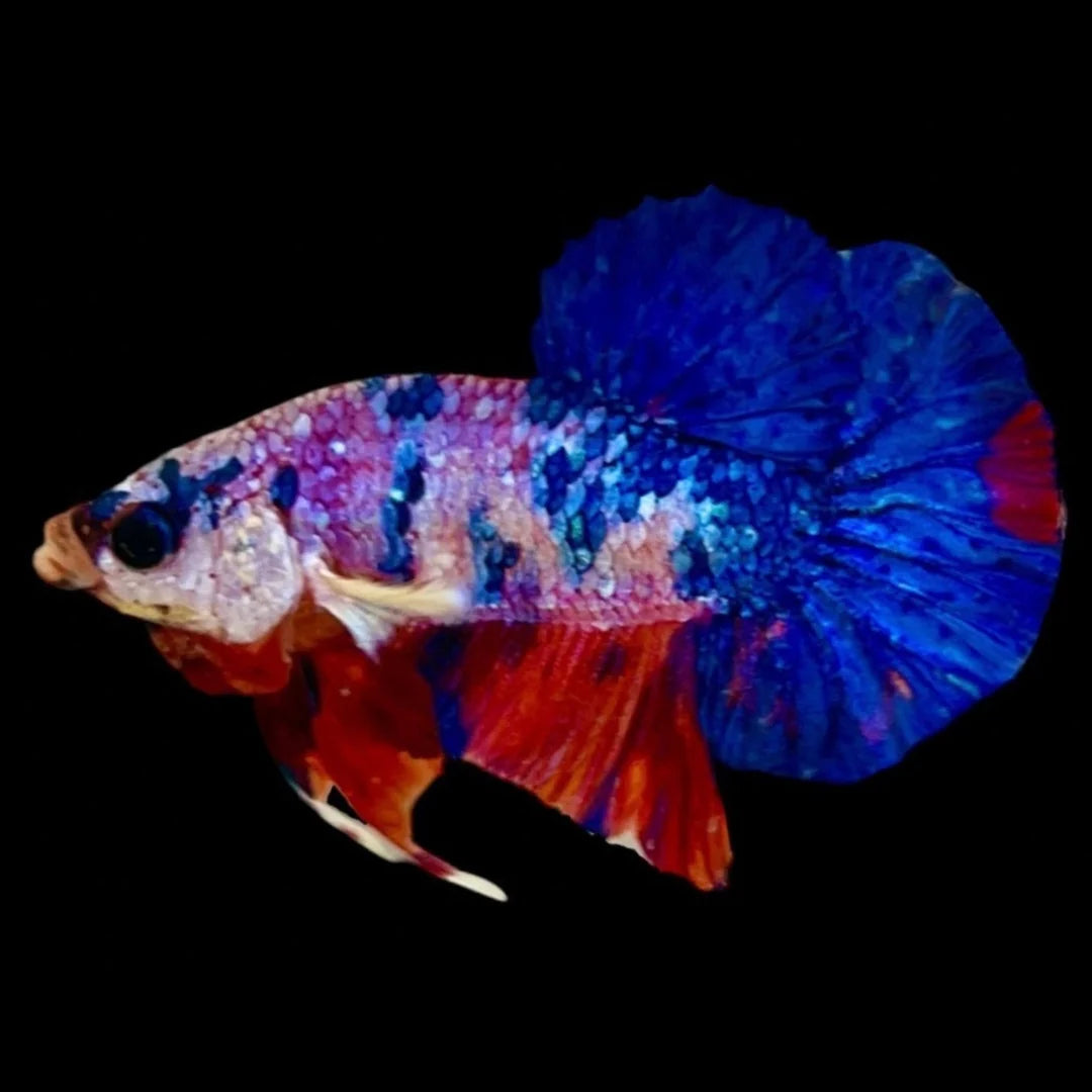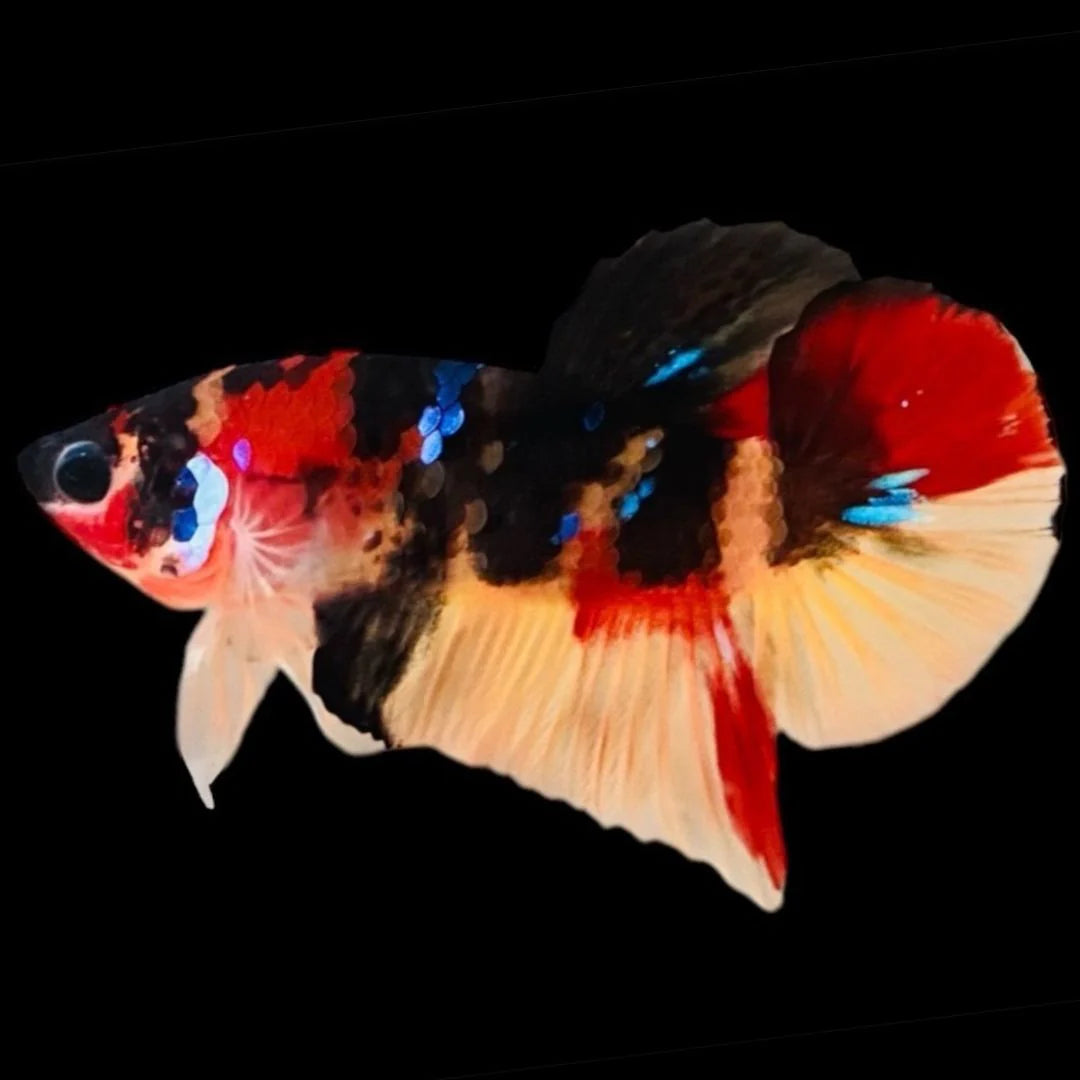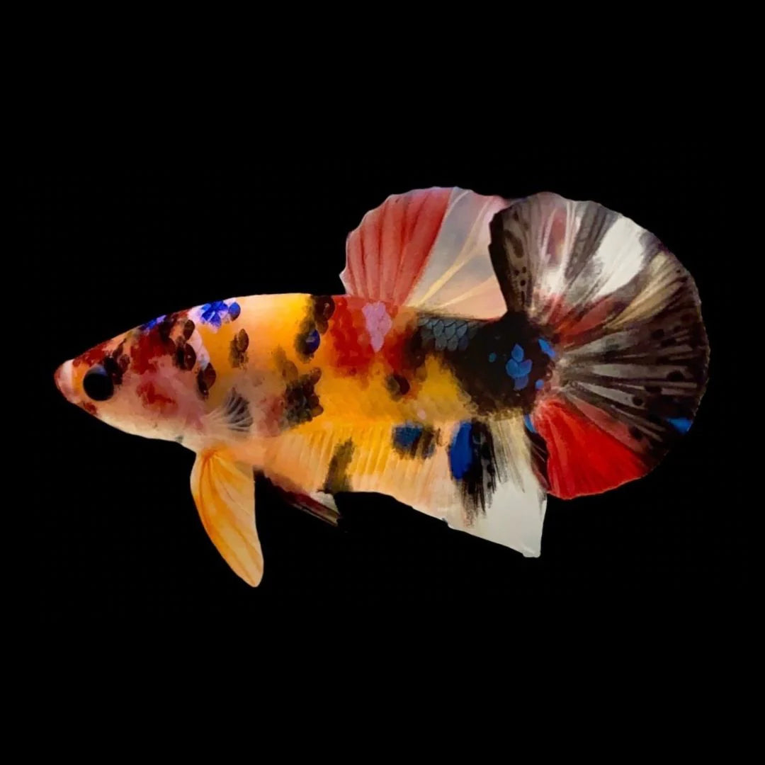 - Galaxy Koi Plakat Betta: The Galaxy Plakat Betta is known for its star-like speckles and patterns that resemble a starry night sky. These Bettas often display a mix of iridescent blues, purples, and pinks, intermingled with darker spots, creating a mesmerizing cosmic effect.