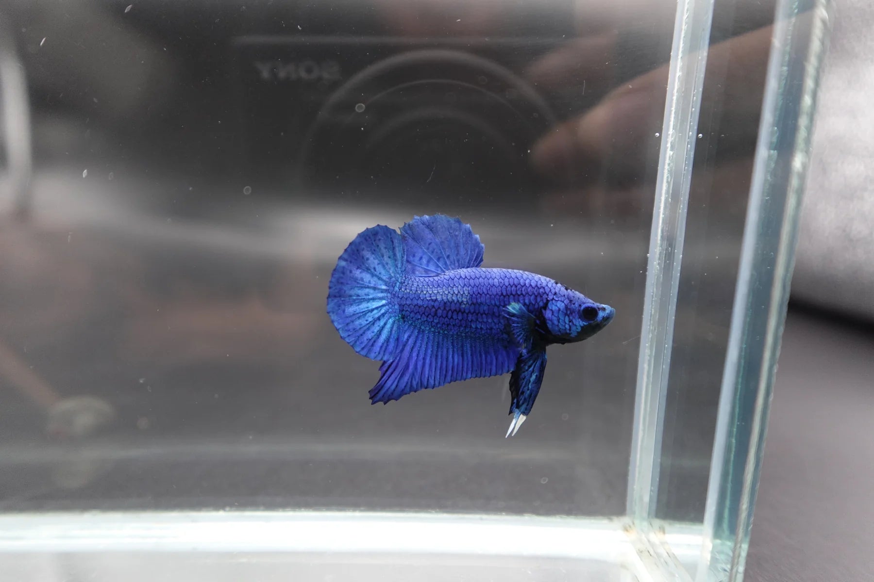 The Navy Blue Betta Fish is a stunning exotic species originating from Thailand, selectively bred by our breeders to have a perfect sparkling navy blue color on its body. Its striking tail and vibrant colors make it a captivating addition to any aquarium. Bring home The Navy Blue Betta Fish today and experience the beauty of this magnificent creature.