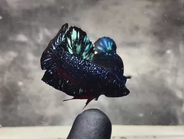 A beautiful and unique variety of the betta fish species. It has a striking black coloration that is accented by iridescent blue spots on its fins and body. Our breeders have selectively bred this fish to have a perfect color on its body. Buy live rare and premium betta fish from thailand and experience the beauty of this magnificent creature.