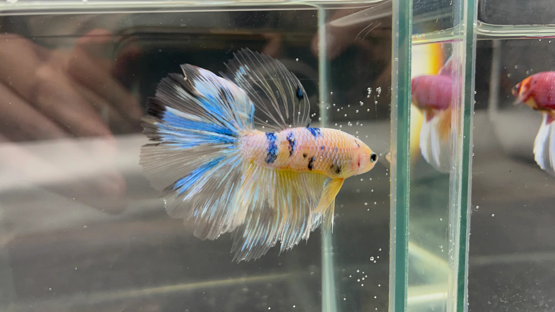 Discover our unique selection of betta fish that are larger than the standard variety. These fish are believed to have originated in Thailand, where many of the most successful and well-known giant betta breeders are located. The majority of giant betta fish sold internationally also come from Thailand. Our betta fish have striking white coloration and are adorned with iridescent yellow and blue on their fins and bodies. Our breeders have selectively crafted a perfect color on their bodies. Buy a rare and premium betta fish from Thailand and marvel at the beauty of these magnificent creatures.